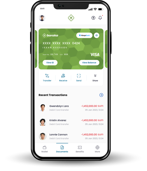 Ijtimoiy yordam (nafaqa) va xizmatlarni olish hamda ularni boshqarish endi yanada osonlashdi. Aloqabank va Xalq banklari tomonidan chiqarilgan Baraka Visa kartasi yordamida to‘lov va xaridlarni nafaqat O‘zbekistonda, balki dunyoning istalgan mamlakatidagi POS-terminallarda amalga oshirishingiz mumkin.